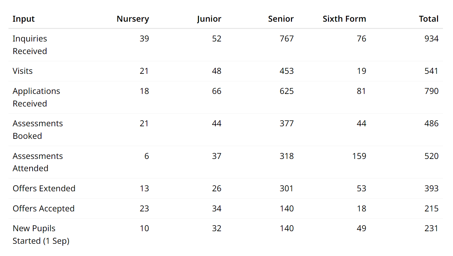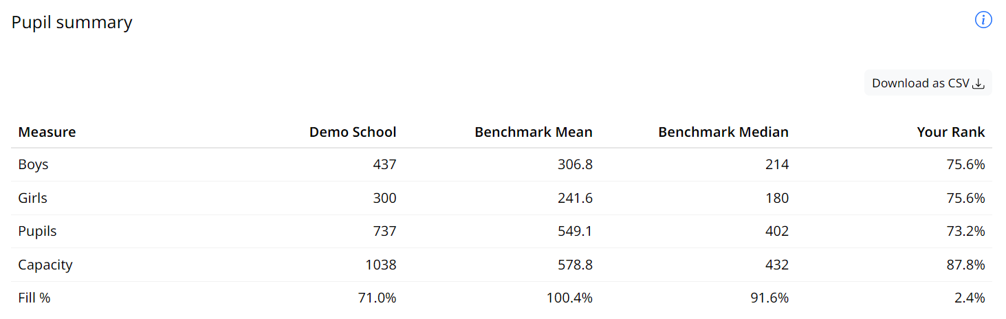 Pupil summary table on School page