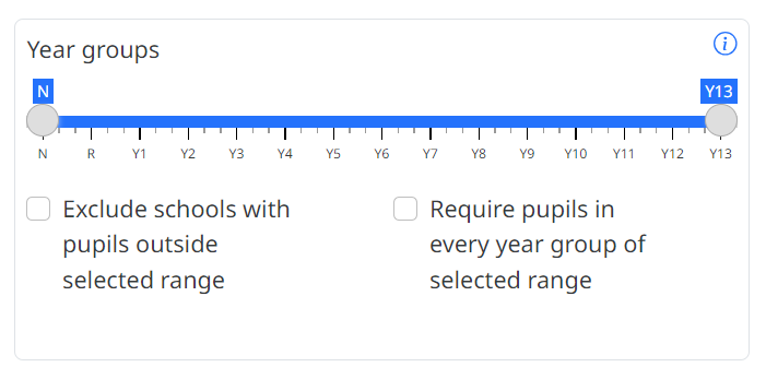 This filter allows you to filter the benchmark based on the year groups using the slider. The slider lets you choose a range of year groups.