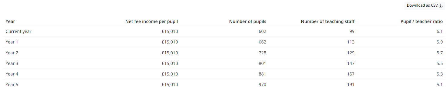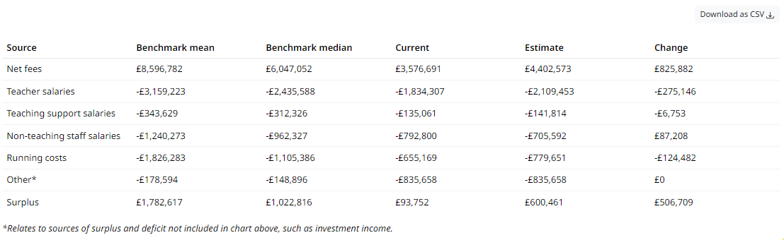 The table above show the progression of key metrics of your school’s finances over the course of the 5-year projection. These metrics are: