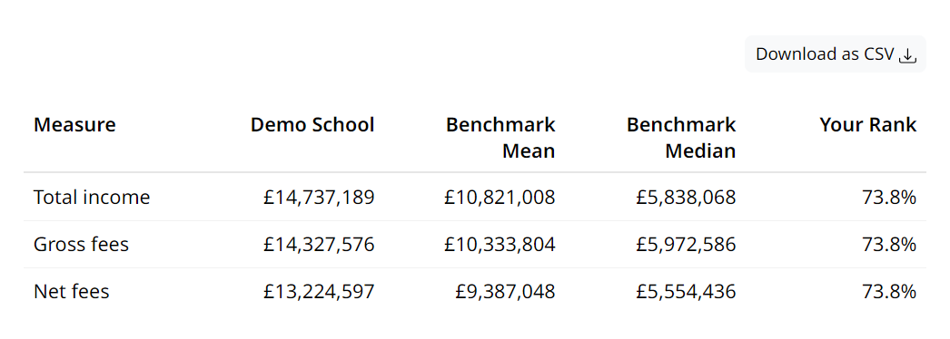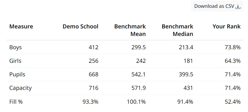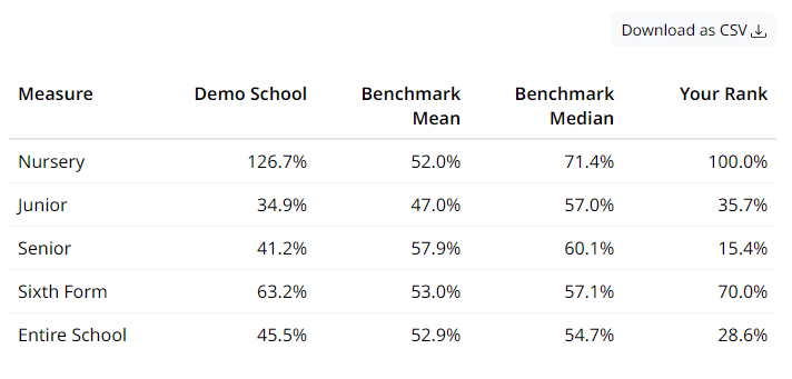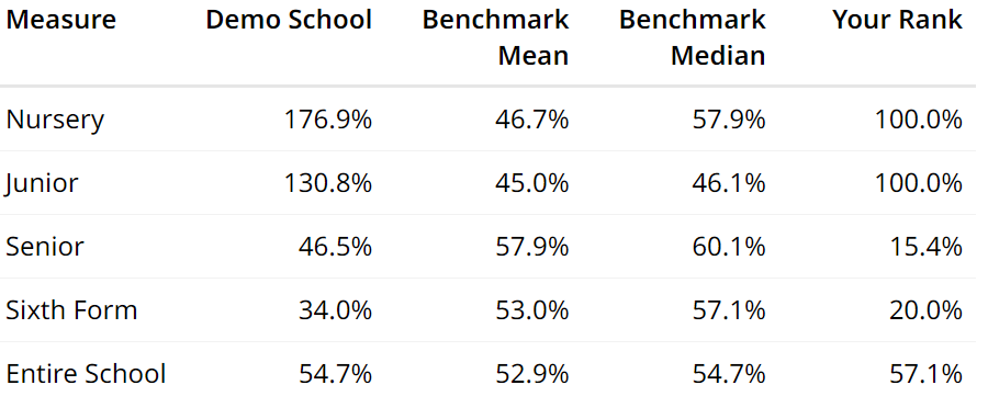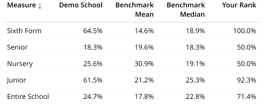 The rank column in a table indicates where in the benchmark group of schools your school lies. For example, a rank of 70% means 30% of schools rank above you and 70% below…